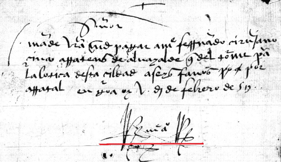 Bilhete assinado por Mestre Afonso (me aº) em 5/02/1513 ordenando pagamento a me Fernando por material (alvaiade) comprado para a botica real