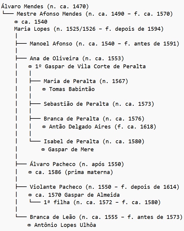 Com Afonso Mendes, vieram, provavelmente também em 1557, sua mulher Maria Lopes e alguns dos cinco filhos que eles já teriam, a saber:  Álvaro Pacheco, Ana de Oliveira, Branca de Leão, Manoel Afonso e Violante Pacheco. Pelo documento no qual o rei de Portugal autorizou seu cirurgião-mor a emigrar para a capital da colônia, sabe-se que Mestre Afonso, como era mais conhecido, era filho de Álvaro Mendes, natural de Portel, vila no distrito de Évora, no Alentejo Central. O mestre cirurgião faleceu no Brasil após 14 anos de serviços prestados a Mem de Sá, de quem foi médico pessoal. Entre as pistas esparsas sobre sua vida e as de seus familiares, existem um breve trecho na obra de Frei Jaboatão, os depoimentos prestados ao visitador do Santo Ofício da Inquisição que esteve em Salvador em 1591 e em Pernambuco em 1593 e ainda algumas licenças que certo mestre Afonso recebera do rei português antes de 1557. Em todos esses casos, há evidências esparsas sobre datas e locais que reúno aqui para tentar construir um relato coerente da vida desses meus antepassados que foram várias vezes denunciados por supostamente manter os costumes de seus antepassados.