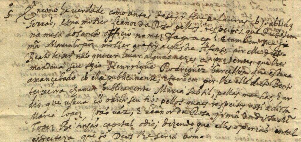 5º. E como é verdade, como antes de se ir, teve palavras com João Vaz Serrão e sua mulher Leonor da Rosa pelos respeitos que tudo tem na Mesa do Santo Ofício no mês da graça e também sua irmã Maria Lopes, mulher que foi de Mestre Afonso, por ele dito Bento Teixeira não querer levar algumas vezes os presentes que lhe mandava seu tio Henrique Rodrigues Barcelos que estava amancebado com ela publicamente e também por ele dito Bento Teixeira chamar publicamente Maria [de] subtil , pelas manhas e ardis que usava com o dito seu tio, pelos quais respeitos assim a dita Maria Lopes, João Vaz e Leonor da Rosa, irmã da dita Maria Lopes, lhe tinham capital ódio, dizendo que eles o [teriam] em tal estreiteza que só Deus lhe seria bom.