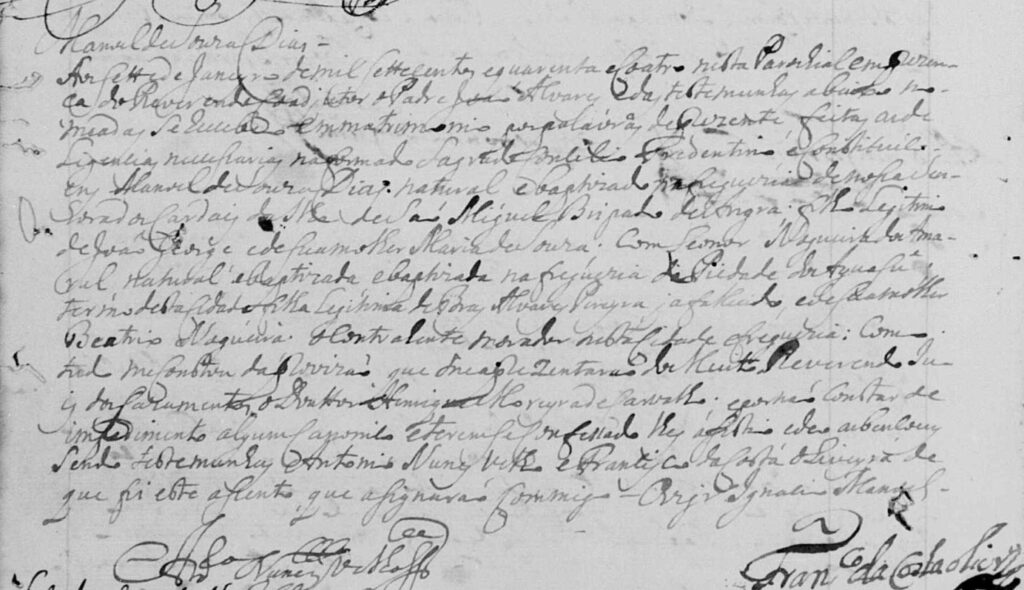 Explorando os vários ramos da ascendência paterna de Gabriel, interessei-me por este: Luiz Gonzaga Correa e Castro (avô) > Luiza Joaquina Pereira da Silva (bisavó) > Luiz Joaquim Pereira da Silva (trisavô) > Joaquina Rosa de Jesus (tetravó) > Maria Antônia de Souza (pentavó) > Manoel de Souza Dias (hexavô). A satisfação com esse ramo inicialmente se deu pela descoberta do sobrenome composto Pereira da Silva, que ocorre no ramo materno de minha bisavó Durvalina. A pista desse sobrenome desapareceu em Joaquina Rosa de Jesus, mas notei que ela chegava a uma pessoa ainda mais interessante: Manoel de Souza Dias, o avô de Joaquina Rosa de Jesus.