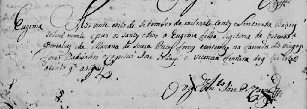 Aos vinte e oito de setembro de mil e setecentos e cinquenta, batizei solenemente e pus os santos óleos a Eugênia, filha legítima de Estêvão Gonçalves e Mariana de Souza, pretos forros assistentes na Fazenda do Viegas. Foram padrinhos o capitão José Nunes e Vicência Ferreira.